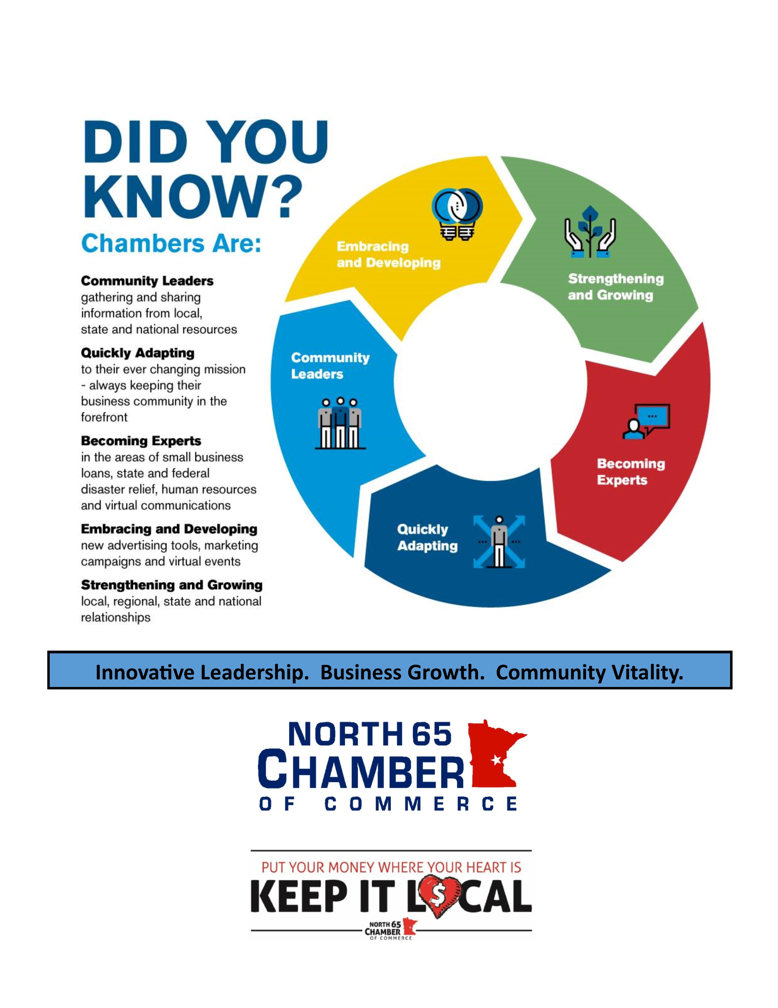 The North 65 Chamber of Commerce is a partnership of businesses, organizations and community members working together to build a healthy economy and to improve the quality of life in the area. Our staff, board of directors, and volunteers are deeply committed to you and your business.
